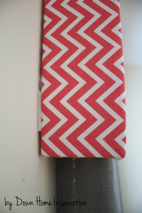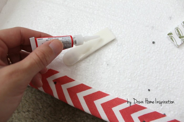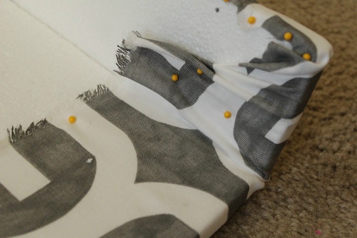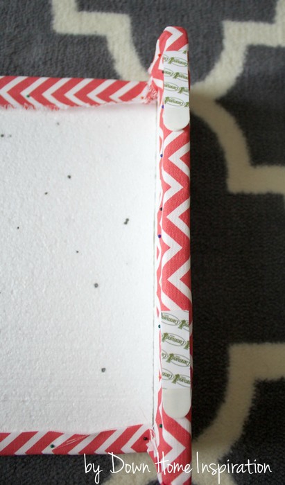 Облицовочную панель обтяните тканью, прихватив края с обратной стороны булавками (можно прикалывать прямо к панели), а лишнее обрежьте.